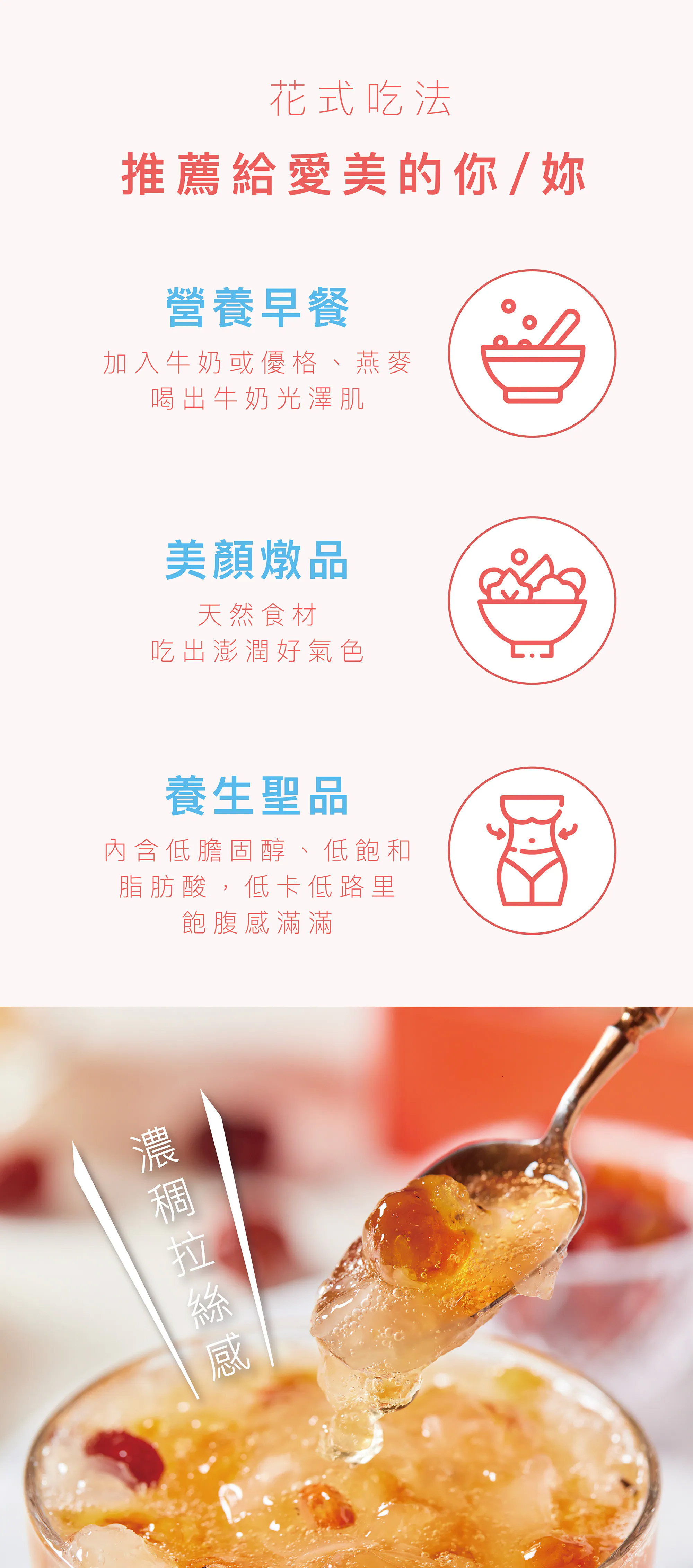 - 除了养颜美容外,也很适合年长者补充胶原蛋白,延缓老化,可以说是阖家都适合。
