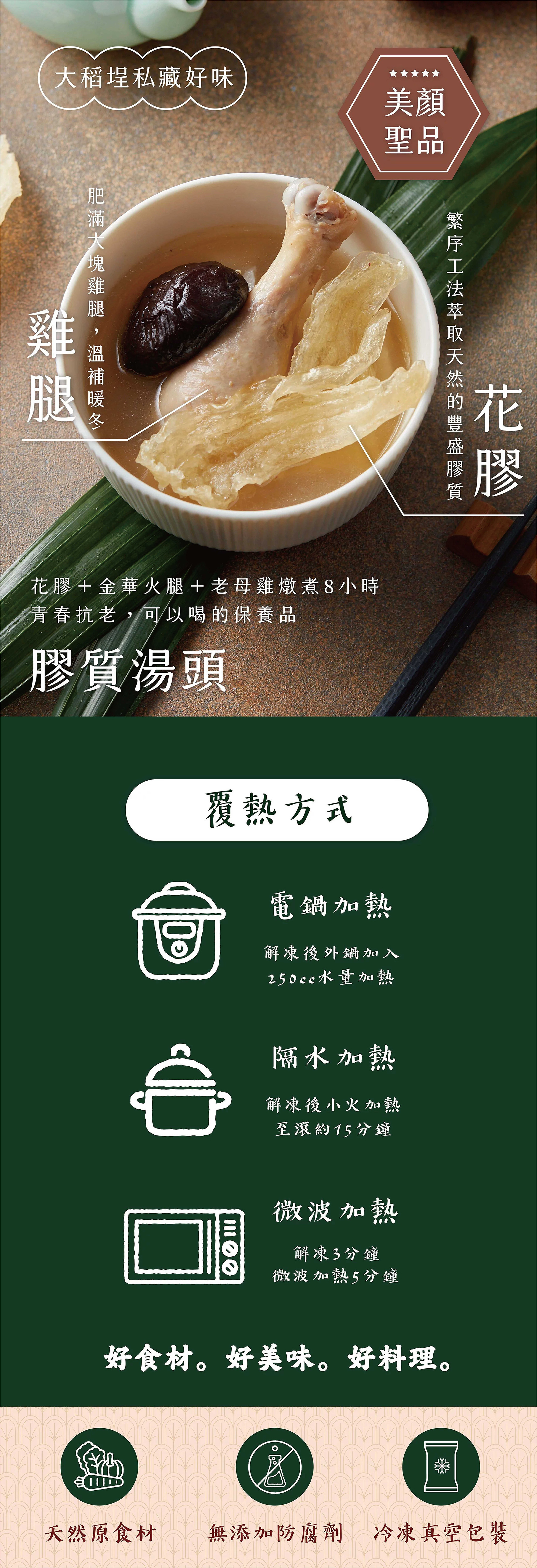 成分:鸡高汤(水、鸡骨、老母鸡、高丽菜、姜、蒜、芹菜、白胡椒粒、月桂叶)、鸡腿、花胶、米酒、火腿[猪后腿肉、食盐、保色剂(亚硝酸钠]、鸡汁(水、盐、鸡肉萃取物(鸡肉萃取物、盐)、L-麸酸钠、糖、鸡油、酵母萃取物(酵母萃取物、盐)、乙醯化己二酸二淀粉、香料、调味剂(5-次黄嘌呤核苷酸二钠、5”-鸟嘌呤核苷磷酸二钠)、明胶、玉米糖胶、B-胡萝蔔素(麦芽煳精、辛烯基丁二酸钠淀粉、葵花油、抗氧化物(L-抗坏血酸钠、维生素C、维生素E)、B-胡萝蔔素])、香菇、碘盐