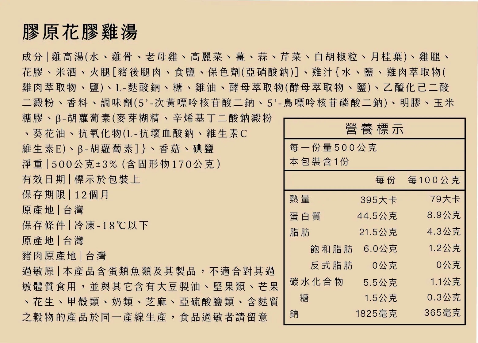 过敏原资讯:本产品含蛋类鱼类及其制品,不适合对其过敏体质食用,并与其它含有大豆制油、坚果类、芒果、花生、甲壳类、奶类、芝麻、亚硫酸盐类、含麸质之谷物的产品于同一产线生产,食品过敏者请留意
