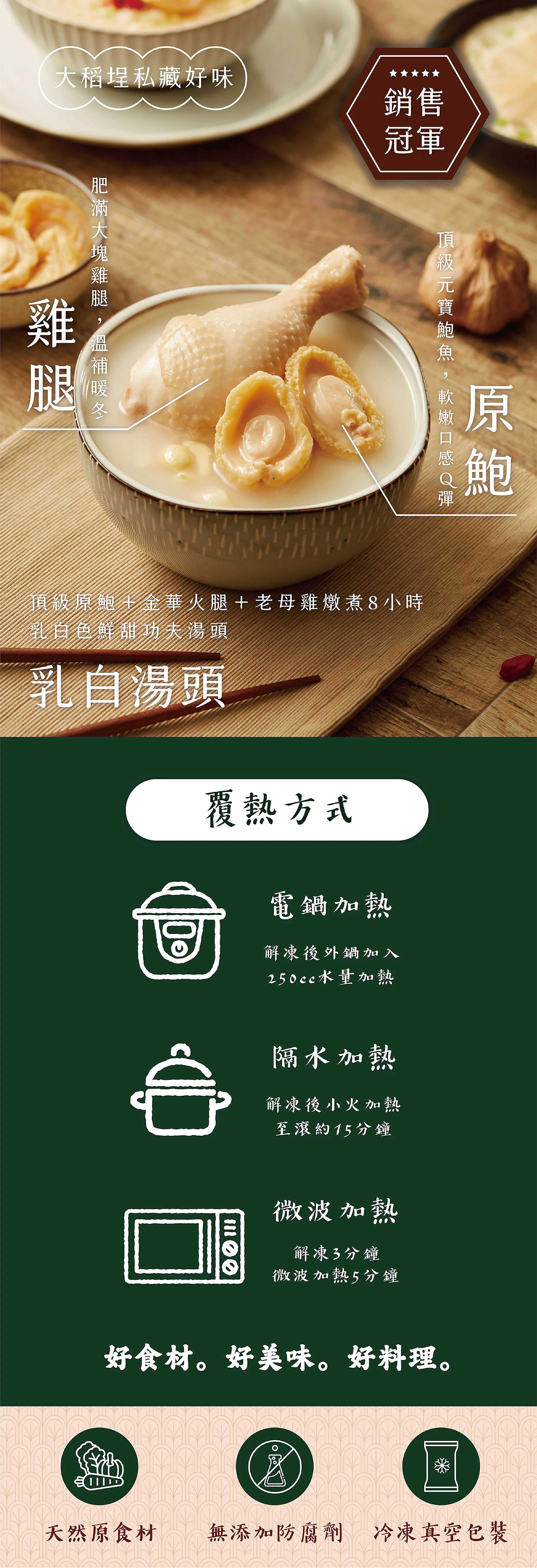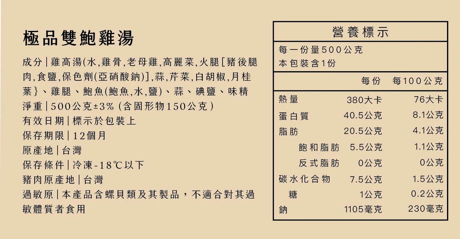 成分:鸡高汤(水,鸡骨, 老母鸡,高丽菜,火腿[猪后腿肉(产地:台湾),食盐,保色剂(亚硝酸钠)],蒜,芹菜,白胡椒,月桂叶)、鸡腿、鲍鱼(鲍鱼,水,盐)、蒜、碘盐、味精
